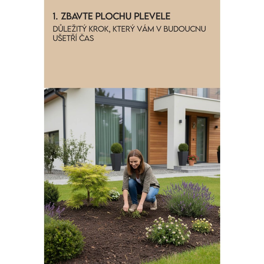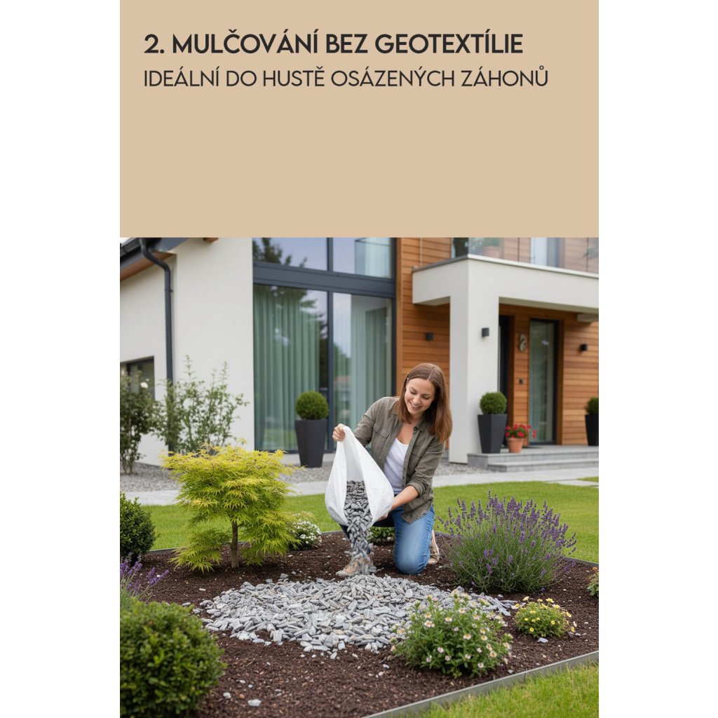 Pokládka bez geotextilie – vhodná do hustě vysázených záhonů nebo svahů, kde by manipulace s textilií byla obtížná. Kůru sypete přímo na připravenou zem mezi rostliny.