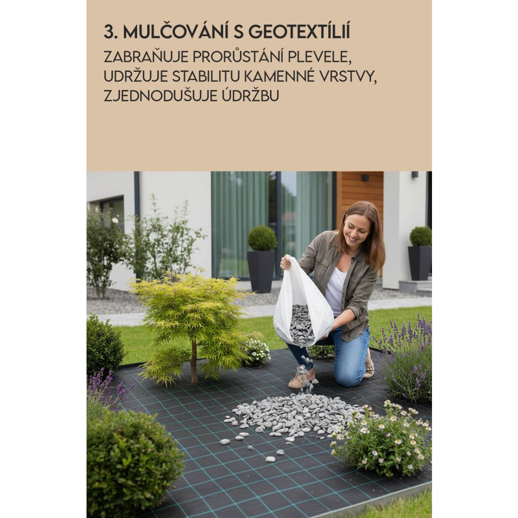 Pokládka na geotextilii – ideální, pokud chcete co nejlépe omezit plevel a udržet kůru čistou a oddělenou od hlíny. Na připravenou zem rozprostřete geotextilii a na ni nasypte vrstvu kamenné kůry (min. 75 kg/m²). Vznikne elegantní, téměř bezúdržbový povrch.