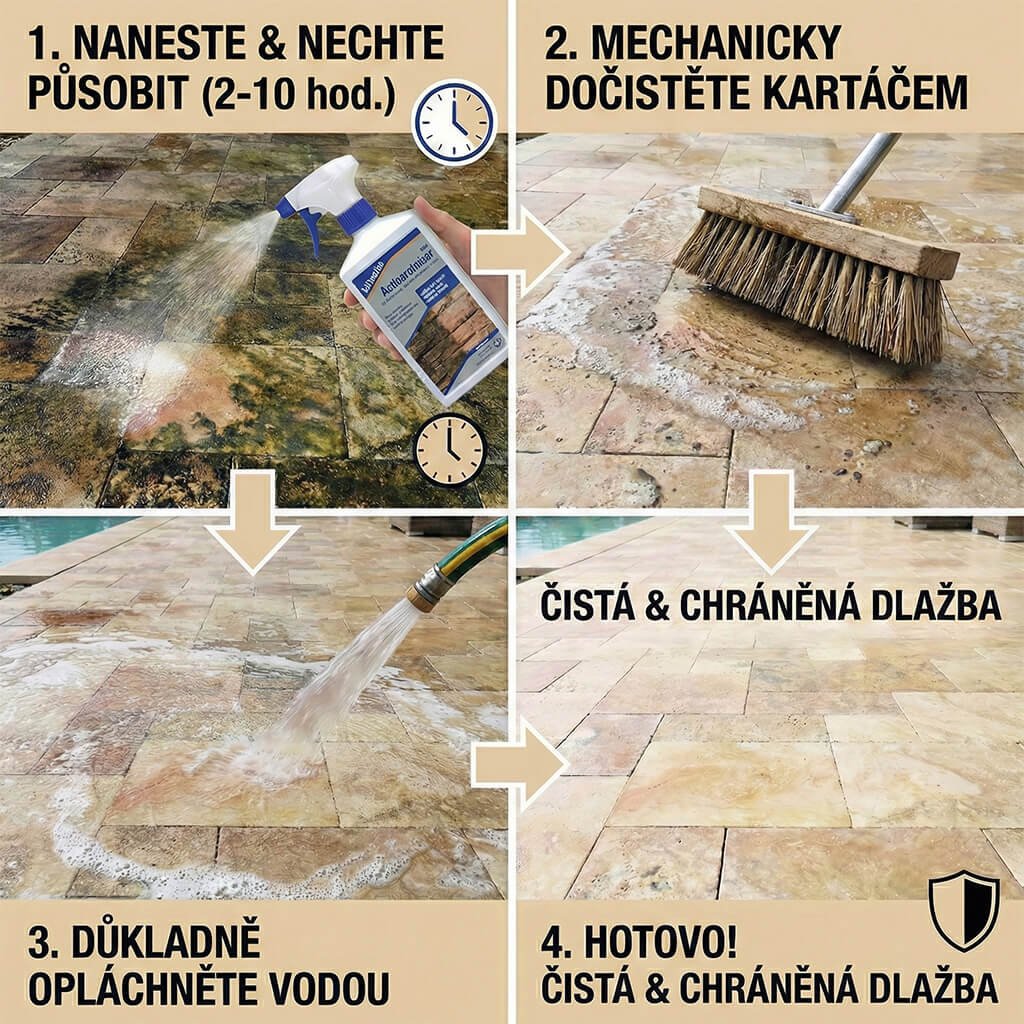 Po uplynutí doby působení plochu důkladně spláchněte vodou. Uvolněné nečistoty a zbytky mechu můžete snadno odstranit hrubým kartáčem.