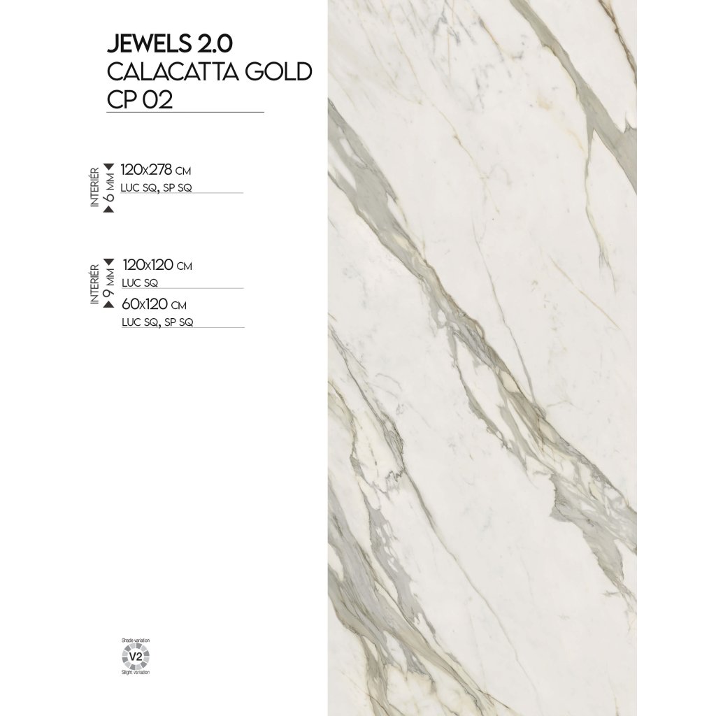 Jewels 2.0 CP 02 Calacatta Gold zaujme svým noblesním dekorem výrazných zlatých žil na světlém povrchu. Hladká úprava zdůrazňuje kontrast mezi barvami a přispívá k oslňujícímu dojmu. Velkoformátové provedení s minimálními spárami je ideální volbou pro prostorné koupelny, kuchyně i obývací pokoje. V komerční sféře najdou uplatnění v hotelech, spa centrech či prestižních kancelářích, kde dodají prostoru osobitý a rafinovaný styl. Lesklé velkoformátové dlaždice minimalizují spáry, čímž přispívají k čistému a soudržnému vzhledu.