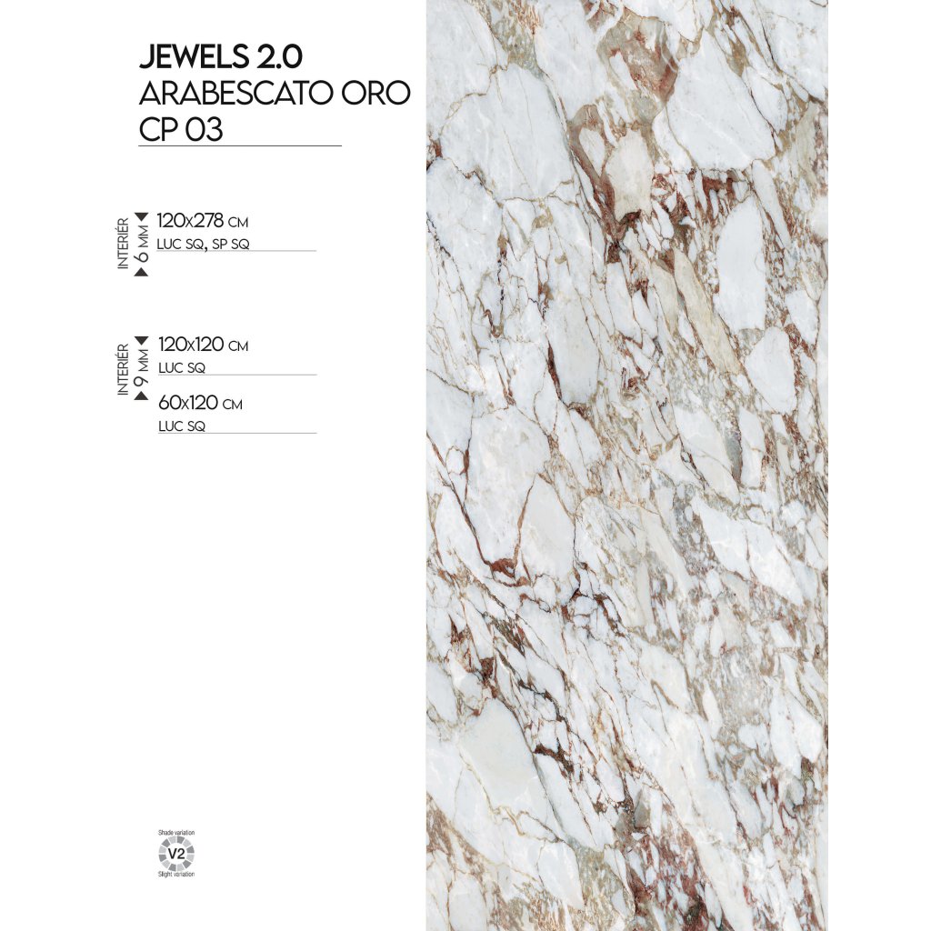 Obklad a dlažba Jewels 2.0 CP 03 Arabescato Oro je inspirována sofistikovanými strukturami přírodního kamene. Dekor kombinuje světlý povrch s hustým žilkováním v mnoha odstínech, které dodají dlaždicím jedinečnost. Lesklý povrch a velkoformátové provedení zdůrazňují jejich moderní charakter, zatímco snadná údržba zvyšuje jejich praktičnost. Perfektně se hodí do reprezentativních interiérů, jako jsou haly nebo luxusní restaurace, i do soukromých koupelen a kuchyní.