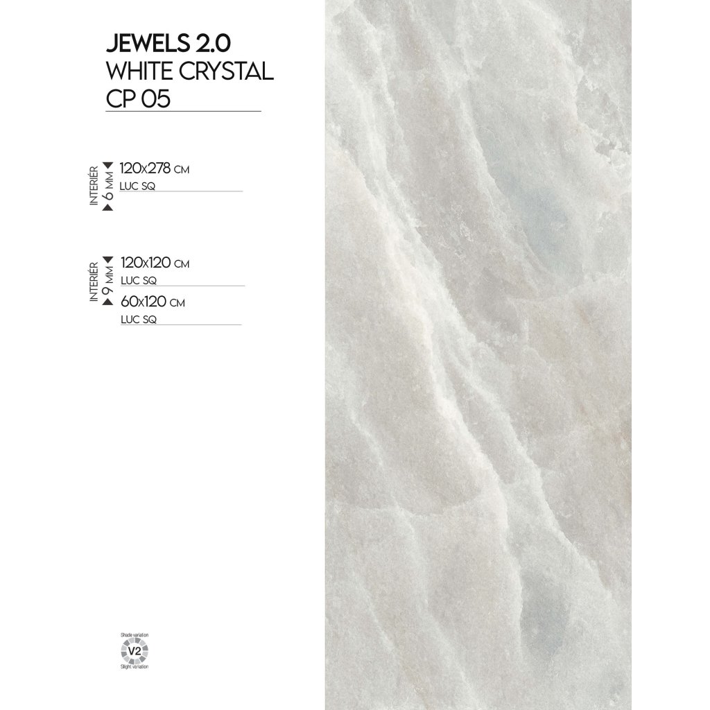 Minimalismus a čistota se snoubí v Jewels 2.0 CP 05 White Crystal. Lehké žilkování dodává obkladu a dlažbě nadčasový vzhled, který se snadno kombinuje s různými interiérovými styly. Lesklá úprava podtrhuje jejich elegantní charakter, zatímco velké rozměry s minimálními spárami přispívají k pocitu prostornosti. Tyto dlaždice jsou ideální do soukromých i komerčních prostorů, jako jsou hotelové lobby nebo wellness zóny.