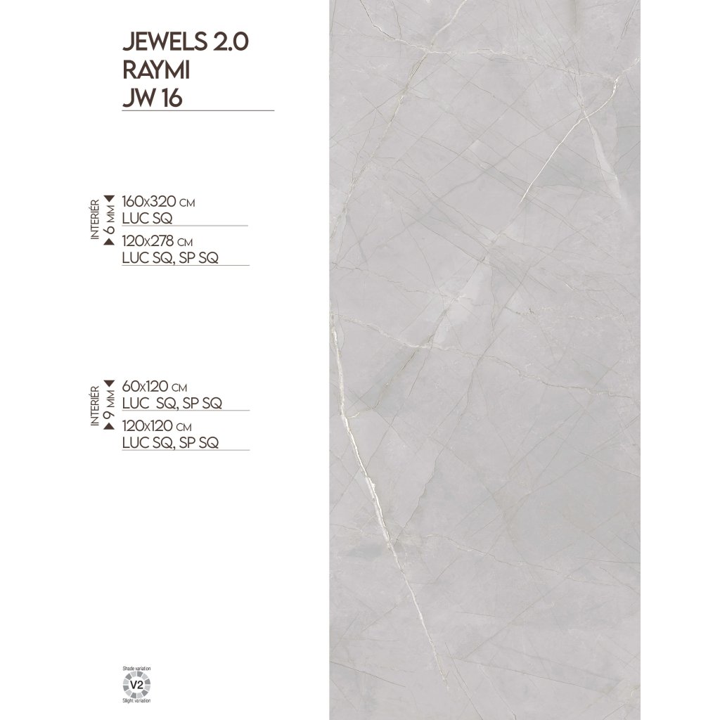 Jewels 2.0 JW 16 Ryami je luxusní keramická dlažba a obklad se světle šedým základem, zdobeným decentním žilkováním, které evokuje přirozenou kresbu mramoru. Lesklý povrch zdůrazňuje jeho sofistikovaný charakter a dodává prostoru exkluzivní atmosféru. Velkoformátové provedení navíc minimalizuje spáry, usnadňuje údržbu a přispívá k harmonickému dojmu celistvého povrchu. Tento typ je ideální pro soukromé projekty, jako jsou obývací pokoje, koupelny či kuchyně, kde zvýrazní eleganci a vkus. V komerčním sektoru se skvěle uplatní například v hotelových lobby, stylových restauracích nebo prestižních kancelářských prostorách, kde podtrhne reprezentativní charakter interiéru.
