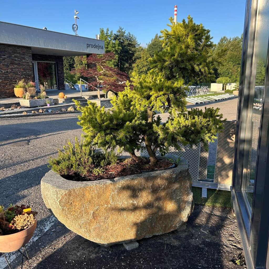 Květináč je vyroben z jednoho kusu přírodní žuly s přibližnými rozměry 140 × 70 × 60 cm. Jeho měkce zaoblený tvar působí přirozeně, ale zároveň dostatečně výrazně, aby zaujal jako dominanta. Tvarovaný tis doplňuje celý prvek o živý kontrast – jeho husté jehličí a výrazná struktura dodávají celé kompozici hloubku a výraz.
