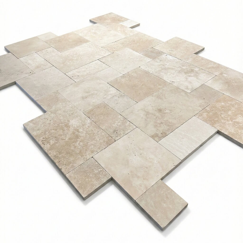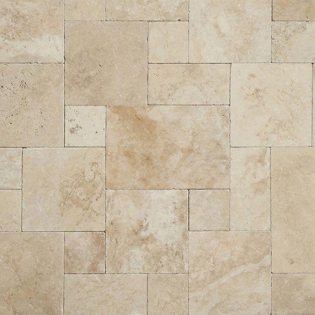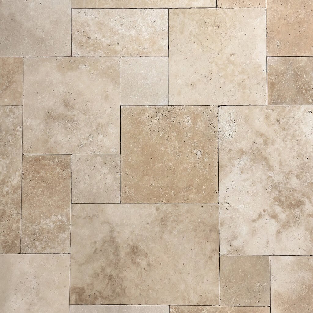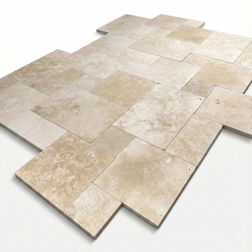 Travertin v románském patentu vynikne mnohem víc než v jednom jediném formátu – hezky se ukáže barevná kresba i struktura kamene.