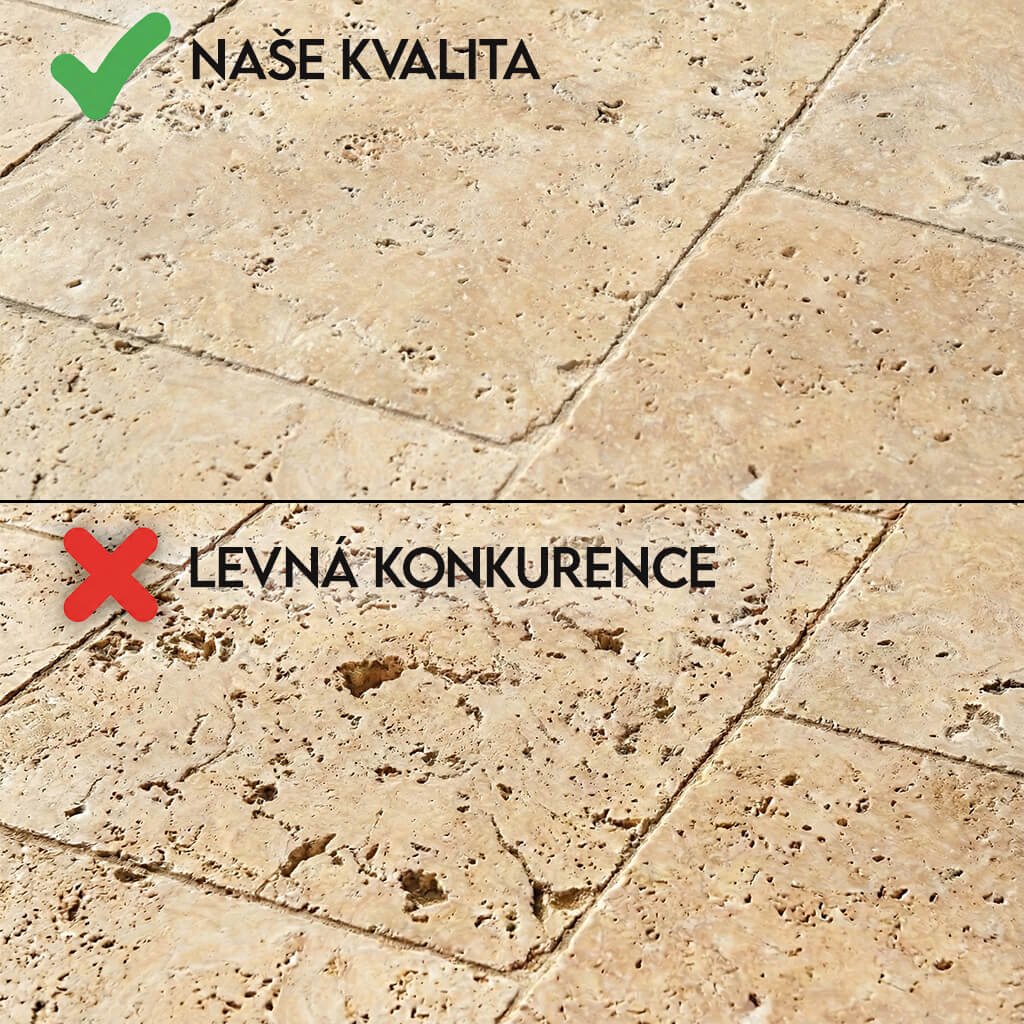 Není travertin jako travertin. Na trhu se často setkáte s levnější 2. jakostí (tzv. "Commercial"), která připomíná ementál – má díry skrz naskrz a je křehká. Lima Multi od nás je v 1. jakosti (Selection). To znamená, že kámen je hutný, masivní a má pouze povrchové póry, které tvoří jeho charakter. Kupujete poctivý kus materiálu, nikoliv "vzduch" a riziko prasknutí.