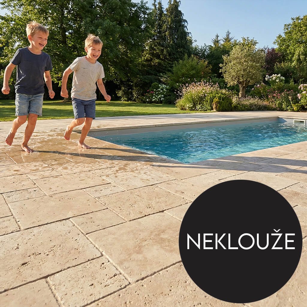 U travertinu Lima Multi nečekejte žádné dodatečné nátěry – jeho bezpečnost je přirozenou vlastností samotného kamene. Unikátní mikritická textura vytváří přirozený protiskluz s certifikovanými hodnotami SRV 45 a R11, což zajišťuje vynikající mechanickou přilnavost pro chodidlo. Povrch účinně narušuje souvislou vrstvu vody (vodní film), čímž minimalizuje riziko uklouznutí u bazénu nebo po letním dešti. Velkou výhodou oproti uměle zdrsněným povrchům, které bývají pro bosou nohu nepříjemné jako „šmirgl“, je haptický komfort – kámen zůstává na dotek sametově hladký, ale přitom vás v kritický moment spolehlivě „podrží“.
