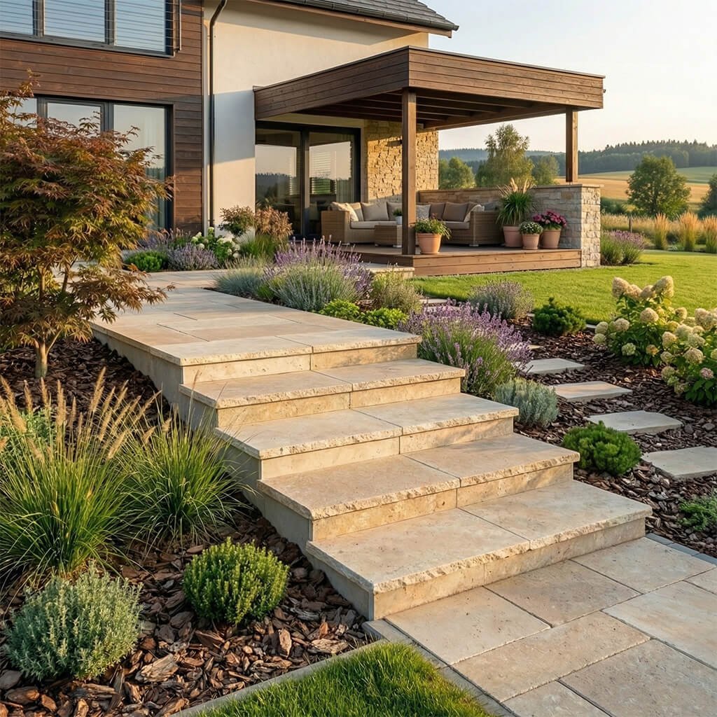 Varianta B: Kamenný obrubník z dlažby (Decentní lem) Pro elegantní zakončení ve stejném designu můžete vytvořit obrubník přímo z kamene.