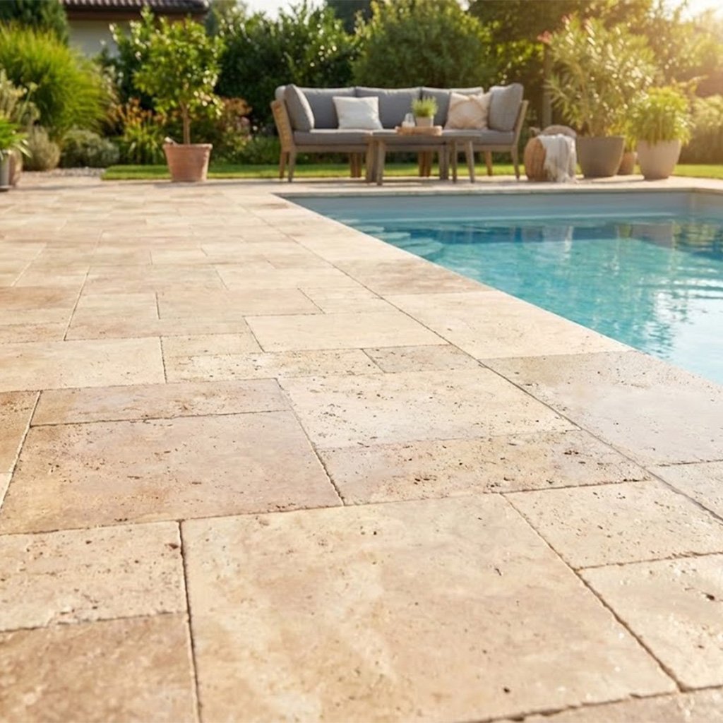 Interiér i exteriér – podle tloušťky a typu travertinu je románský patent skvělý jak do interiéru (podlaha, chodby, kuchyně), tak na terasy, kolem bazénu nebo vstupy do domu.