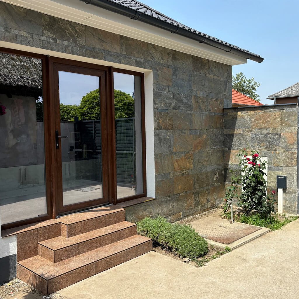 Obklad Fleta Rust nabízí kombinaci odolnosti přírodního kamene a estetické variability, která umožňuje jeho použití v široké škále architektonických řešení. Strukturovaný povrch břidlice působí plasticky a mění svůj vzhled podle intenzity a směru světla – v interiéru jej lze umocnit nasvícením bodovými nebo LED světly, v exteriéru pak přirozeným slunečním světlem. Formát 60 × 30 cm s tloušťkou 0,8 - 1,5 cm zajišťuje elegantní a čisté linie, které lze snadno kombinovat s dřevem, kovem, sklem nebo omítkou.